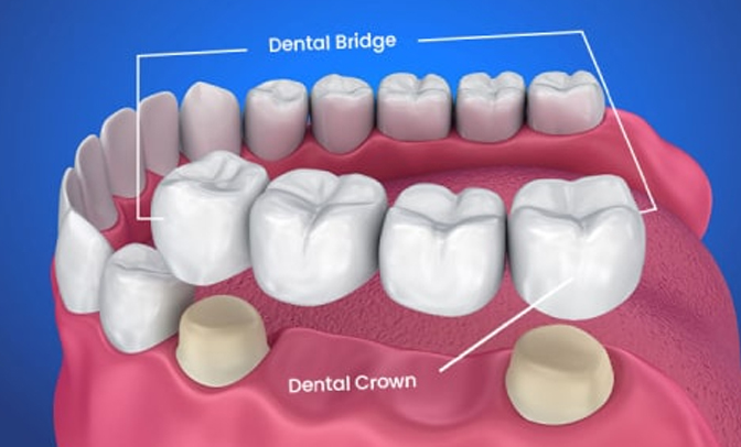 They are two different types of dental prosthesis used to replace and restore the damaged, broken or lost teeth. Dental crown is a tooth shaped cap that is placed over the damaged or carious tooth that is root canal treated to restore its function and help you chew food. There are different types based on material, they are Porcelain, ceramic, metal, zirconia, E-max crowns. A dental bridge on other hand is a combination of crowns that is used to replace a missing tooth by taking support from its adjacent teeth.